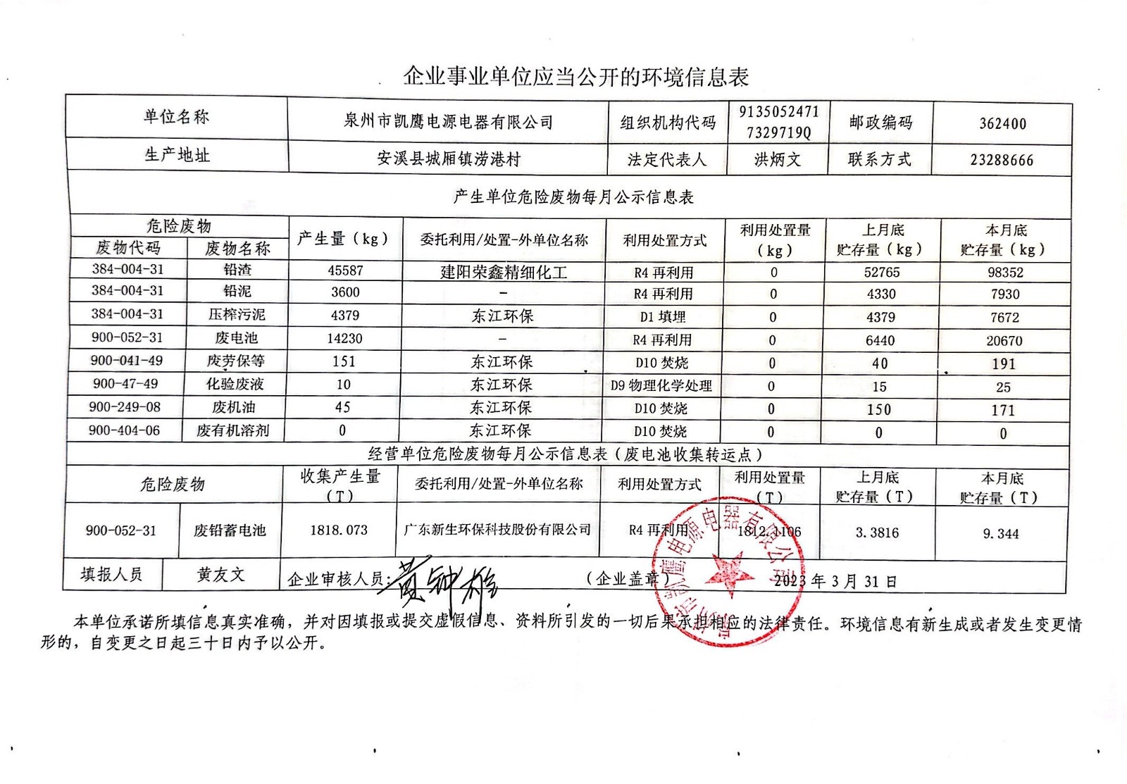 泉州市凯鹰电源电器有限公司环境信息表(2023年3月)